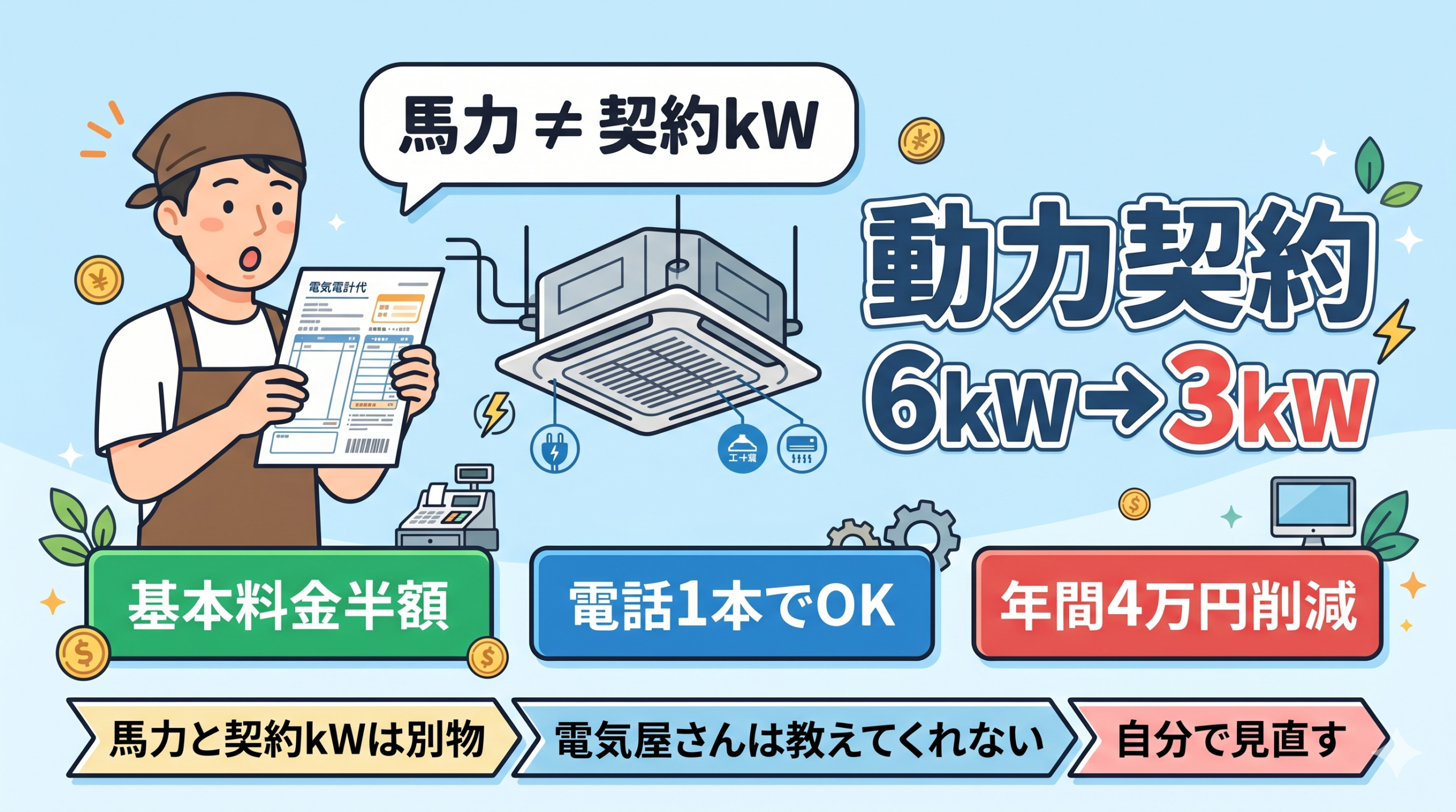 電気代の請求書に「動力」欄がある方は、一度契約kWを確認してみてください。5分で気づける可能性のある、大きな固定費削減です。